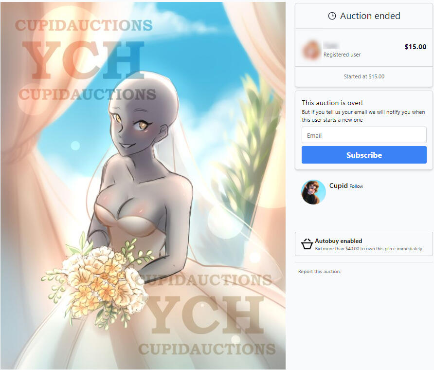 Here a example, as you can see this YCH SB is 15$, with an 40$ AB. When the auction is running you can buy it for under 40$ because of the nature of an auction, you could take it before the end of it for the AB, or wait hoping that anyone will bid higher than you. When you come to me wanting the same YCH outside an auction, I will consider the AB price, since this would be the value you would pay to get it immediately.If you want to get one of the YCHs please fill up this form.